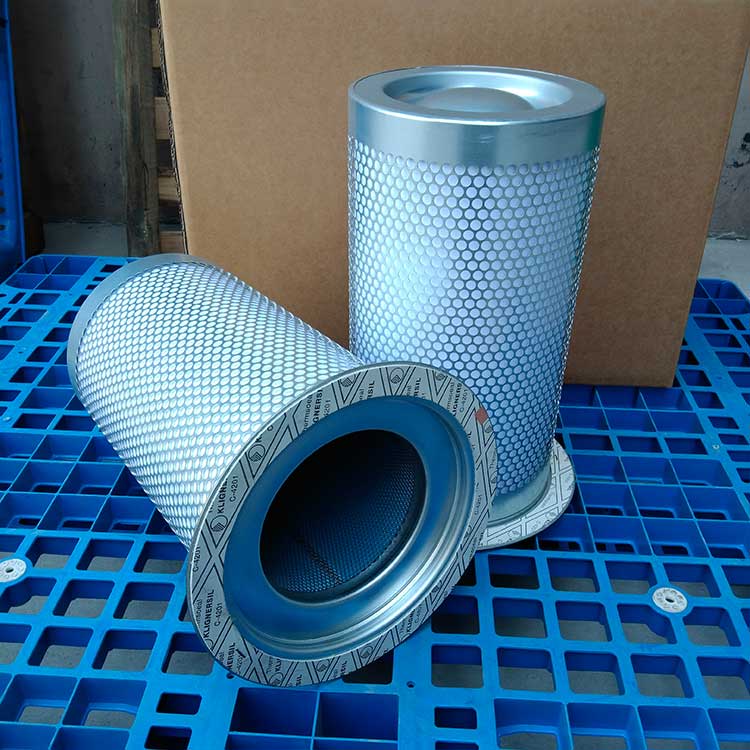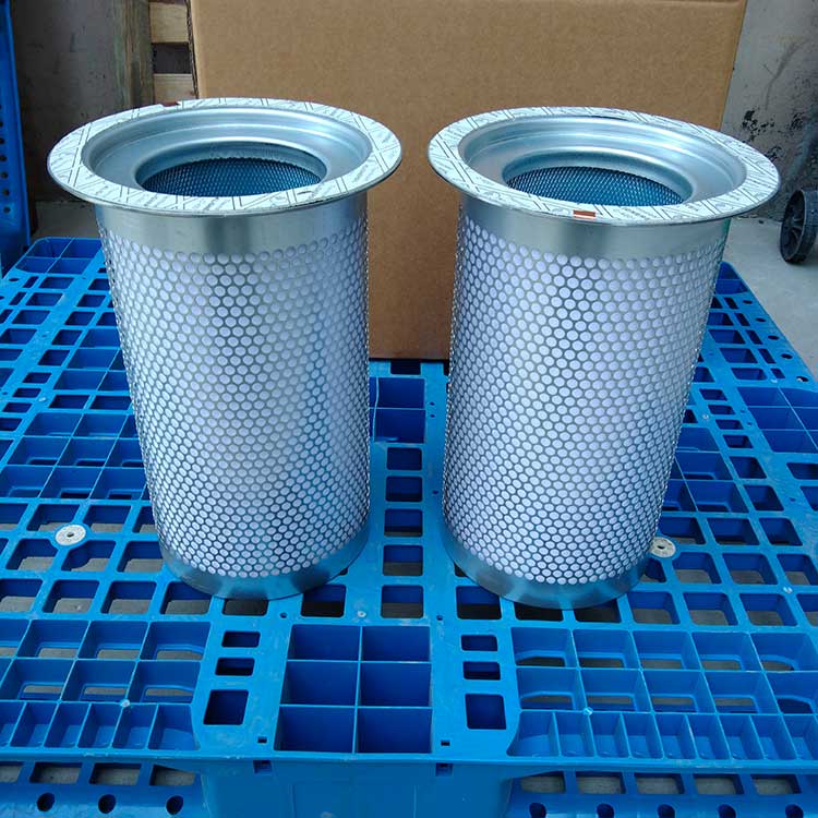 油氣分離元件是決定空壓機壓縮空氣品質(zhì)的關(guān)鍵部件,高質(zhì)量的油氣分離元件不僅可保證壓縮機的高效率工作,且濾芯壽命可達數(shù)千小時。從壓縮機頭出來的壓縮空氣夾帶大大小小的油滴,大油滴通過油氣分離罐時易分離,而小油滴(直徑1μm以下懸浮油微粒)則必須通過油氣分離濾芯的微米級玻纖濾料層過濾。油微粒經(jīng)過濾材的擴散作用,直接被濾材攔截以及慣性碰撞凝聚等機理使壓縮空氣中的懸浮油微粒很快凝聚成大油滴,在重力作用下油凝聚在油分芯底部,通過底部凹處回油管進口返回機頭潤滑油系統(tǒng),從而使壓縮機排出更加純凈無油的壓縮空氣。壓縮空氣中的固體粒子經(jīng)過油分芯時滯留在過濾層中,這就導致了油分芯壓差(阻力)不斷增加。隨著油分芯使用時間增長,當油分芯壓差達到0.08到0.1Mpa時,或者壓縮空氣出口產(chǎn)生明顯的含油量時,濾芯必須更換,否則增加壓縮機運行成本(耗電或耗油)。